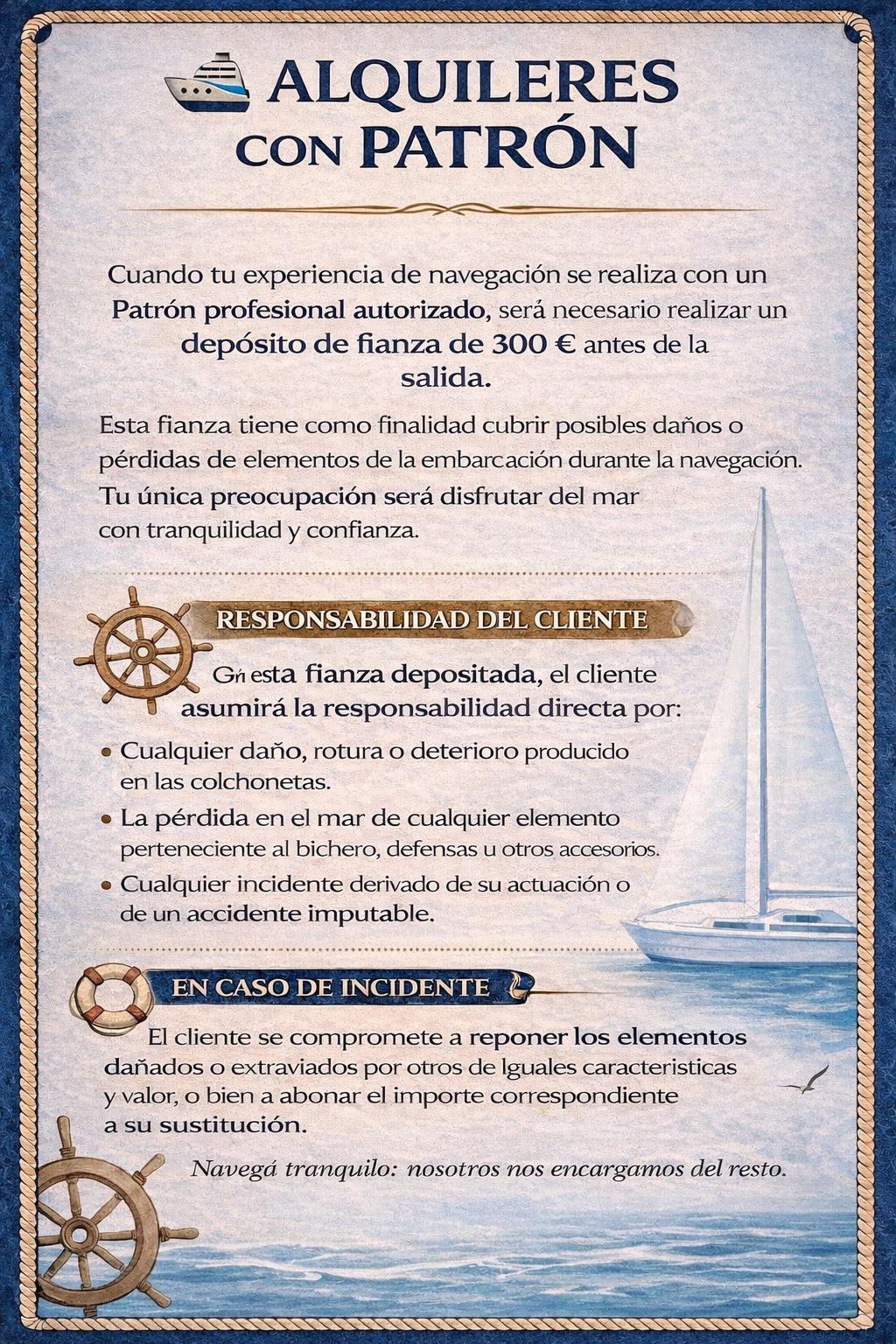 En cuanto al consumo, una de las críticas constructivas más comunes en los más de 200 clientes que tenemos en la empresa es que el consumo es irrelevante, en 4 horas de alquiler no suele ser más de 20,00 ó 30,00 € incluidos los fondeos unos 6 litros a la hora, si mantenemos su velocidad de crucero 15 nudos.